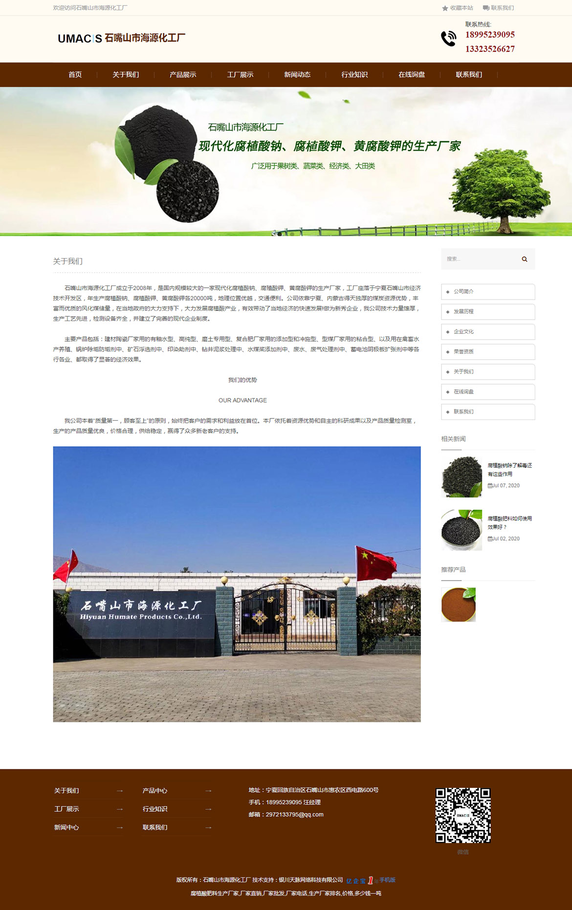 石嘴山市海源化工廠成立于2008年,是國內規模較大的一家現代化腐植酸鈉、腐殖酸鉀、黃腐酸鉀的生產廠家,工廠座落于寧夏石嘴山市經濟技術開發區,年生產腐植酸鈉、腐植酸鉀、黃腐酸鉀各20000噸,地理位置優越,交通便利