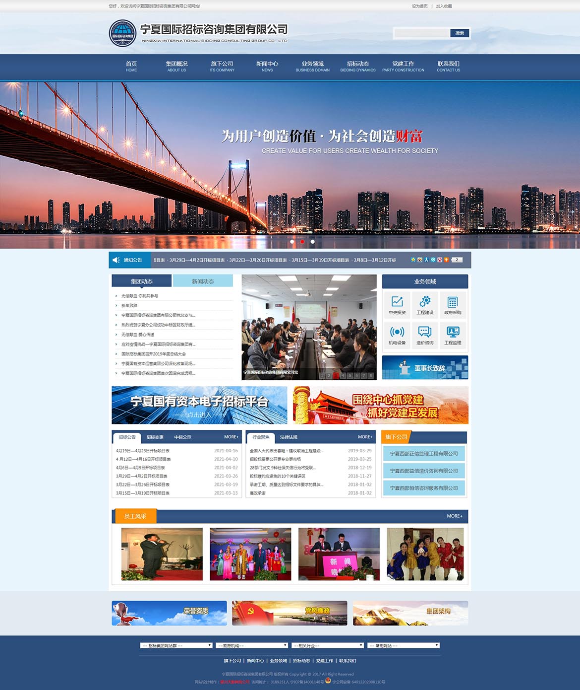 寧夏國際招標(biāo)咨詢集團有限公司注冊于2000年,現(xiàn)注冊資本金3000萬元,是寧夏成立時間最早、集招標(biāo)、造價、咨詢、監(jiān)理于一體的綜合性咨詢服務(wù)機構(gòu)。