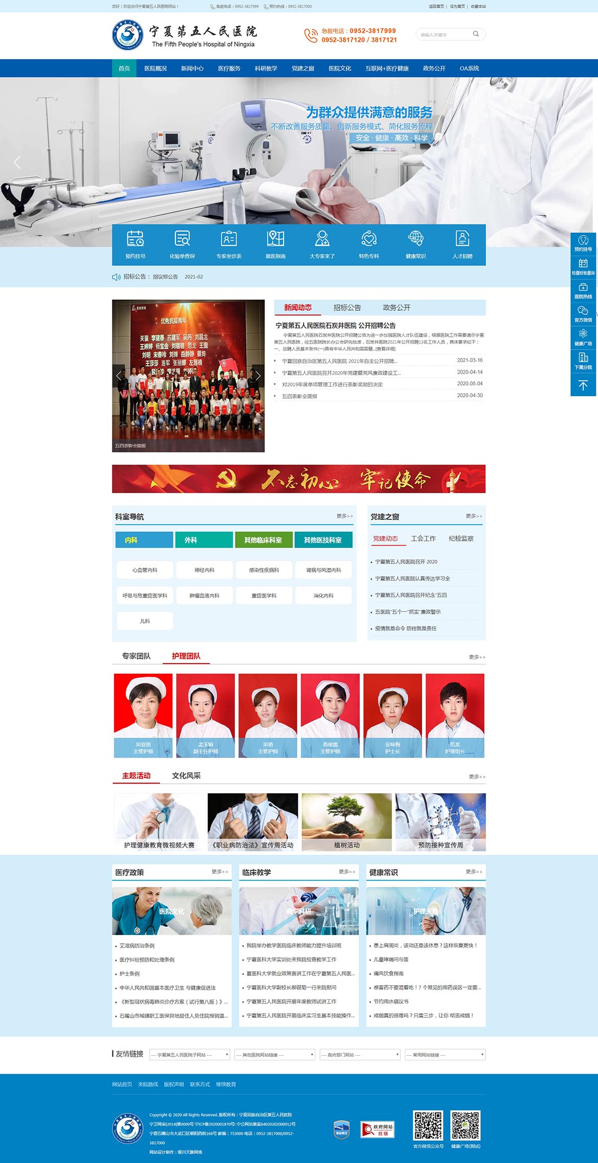 寧夏回族自治區(qū)第五人民醫(yī)院是一所集醫(yī)療、教學(xué)、科研、礦山救護(hù)、預(yù)防保健、康復(fù)為一體的三級乙等綜合醫(yī)院,是國家級“愛嬰醫(yī)院”、衛(wèi)計(jì)委國際緊急救援網(wǎng)絡(luò)醫(yī)院、國家安監(jiān)總局醫(yī)療救護(hù)中心寧夏分中心、寧夏礦山救護(hù)中心、寧夏醫(yī)科大學(xué)教學(xué)醫(yī)院,是寧夏回族自治區(qū)唯一一家通過ISO9001質(zhì)量管理體系認(rèn)證的醫(yī)院。