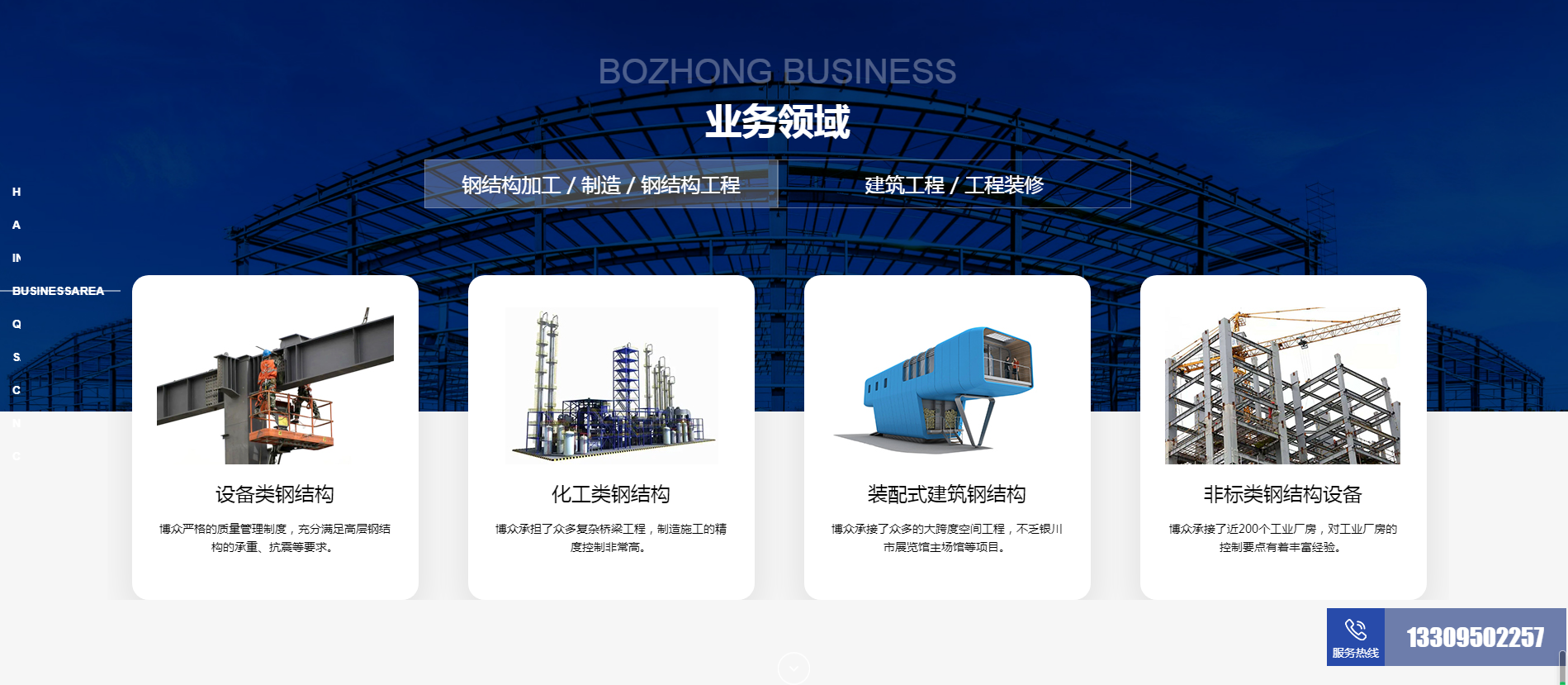 寧夏博眾鋼聯智能制造有限公司成立于2009年,公司坐落于永寧縣望遠工業園區,注冊資本10200萬元,占地500多畝,車間約6萬平方米,年鋼結構產能6萬多噸。2021年9月,寧夏望遠現代金屬物流集團以100%的股權接管北方精工,新的北方精工將以"保護環境,愛護生命,為人類的健康和安全而奮斗"為使命,以"品質優良、服務卓越、誠信服務、客戶至上"為宗旨,奉行"勇于創新、精益求精"的經營理念,實行嚴格的全面質量管理,不斷提高精細化管理水平,不忘初心,切實履行民營企業的社會責任和經濟責任,深入貫徹落實科學發展觀,科學制訂戰略規劃,加快項目開發建設,不斷促進產業結構優化升級,推動資源、區位、人力資源優勢向經濟優勢轉化。