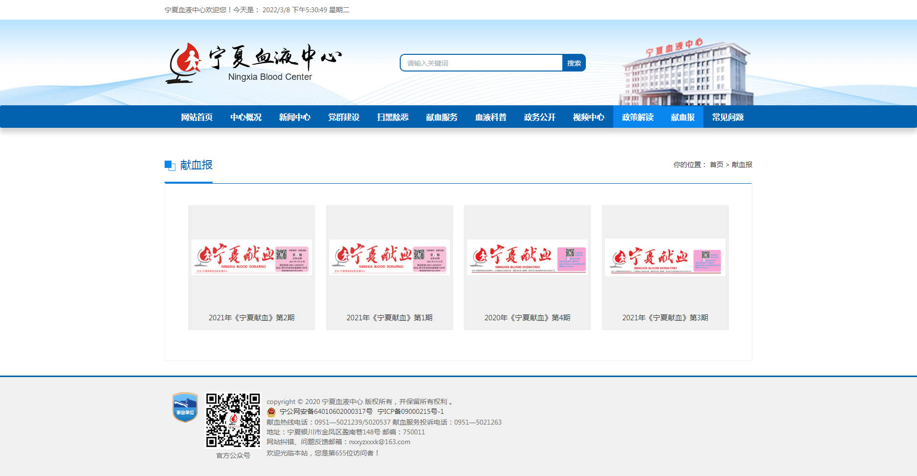 寧夏血液中心是自治區衛生健康委直屬公益一類事業單位。主要承擔銀川市無償獻血招募、血液采集、檢驗檢測、成分制備、血液儲存,轄區內醫療機構臨床用血供應、臨床用血業務指導和全區采供血機構業務培訓、技術指導、質量控制與評價,以及全區血站血液集中化檢測、血液一體化信息系統管理等工作。