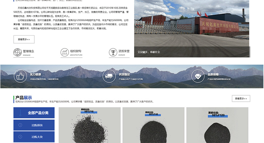 天祝億鑫光伏科技有限公司位于天祝藏族自治縣寬溝工業(yè)園區(qū),是一家招商引資企業(yè),成立于2010年10月,注冊資金500萬元,占地面積107畝。公司以碳化硅為主導(dǎo),是一家集研制、生產(chǎn)、加工、銷售的民營企業(yè)。公司司管理嚴(yán)謹(jǐn),管理模式先進,擁有一支高水平的管理隊伍。現(xiàn)有員工45人。