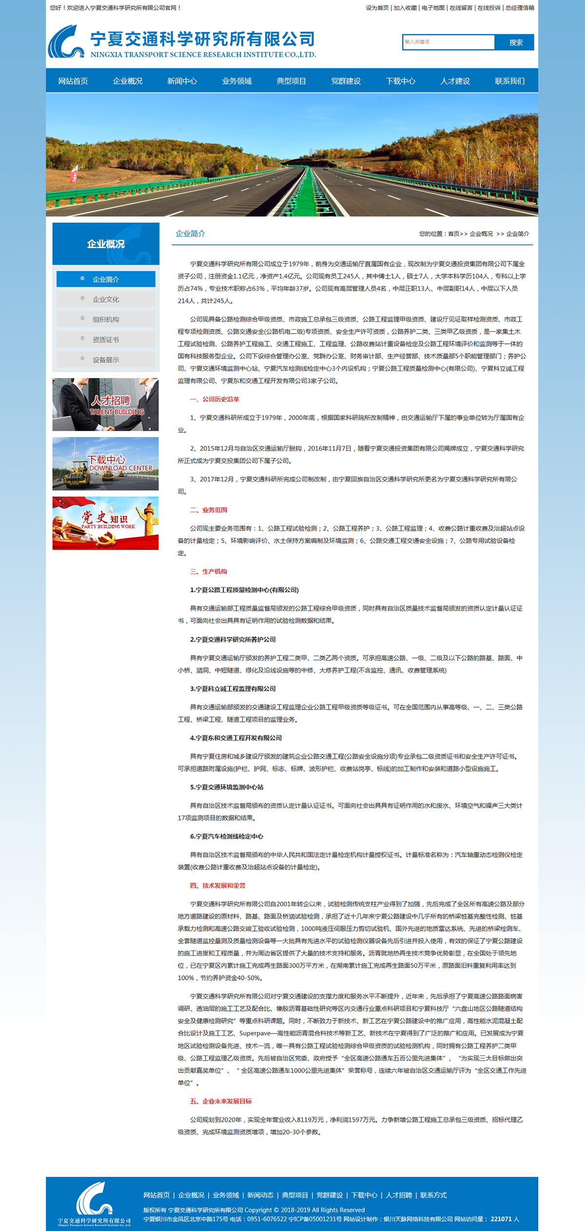 寧夏交通科學研究所有限公司成立于1979年,前身為交通運輸廳直屬國有企業,現改制為寧夏交通投資集團有限公司下屬全資子公司,注冊資金1.1億元,凈資產1.4億元