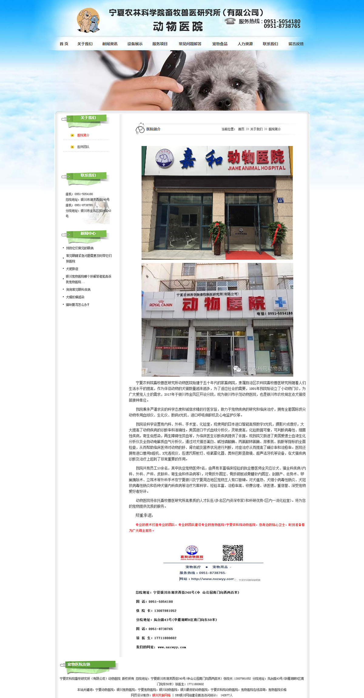 寧夏農科院畜牧獸醫研究所動物醫院始建于五十年代的家畜病院,隸屬自治區農科院畜牧獸醫研究所隨著人們生活水平的提高,作為伴侶動物的犬貓數量越來越多,為了適應社會的需要,1991年我院始設立了小動物門診,為廣大愛寵人士的需求,2017年于銀川市金鳳區開設分院,現為銀川市示范動物醫院,也是銀川市農牧局定點犬貓疫苗接種單位。
