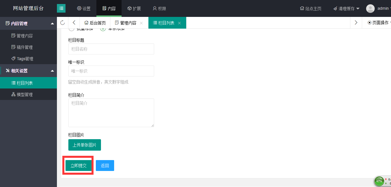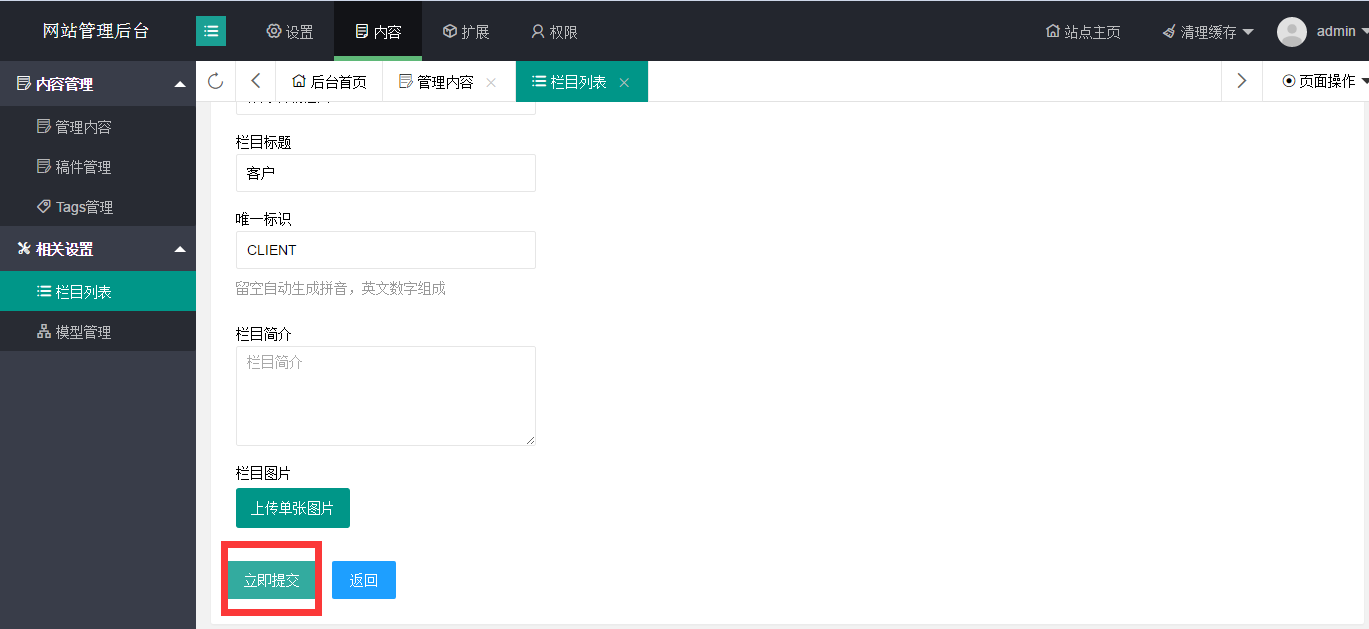 添加子欄目時,選擇相對應的一級欄目,然后添加子欄目,將圖中紅框所指的內容添加完整后,點擊立即提交即可。