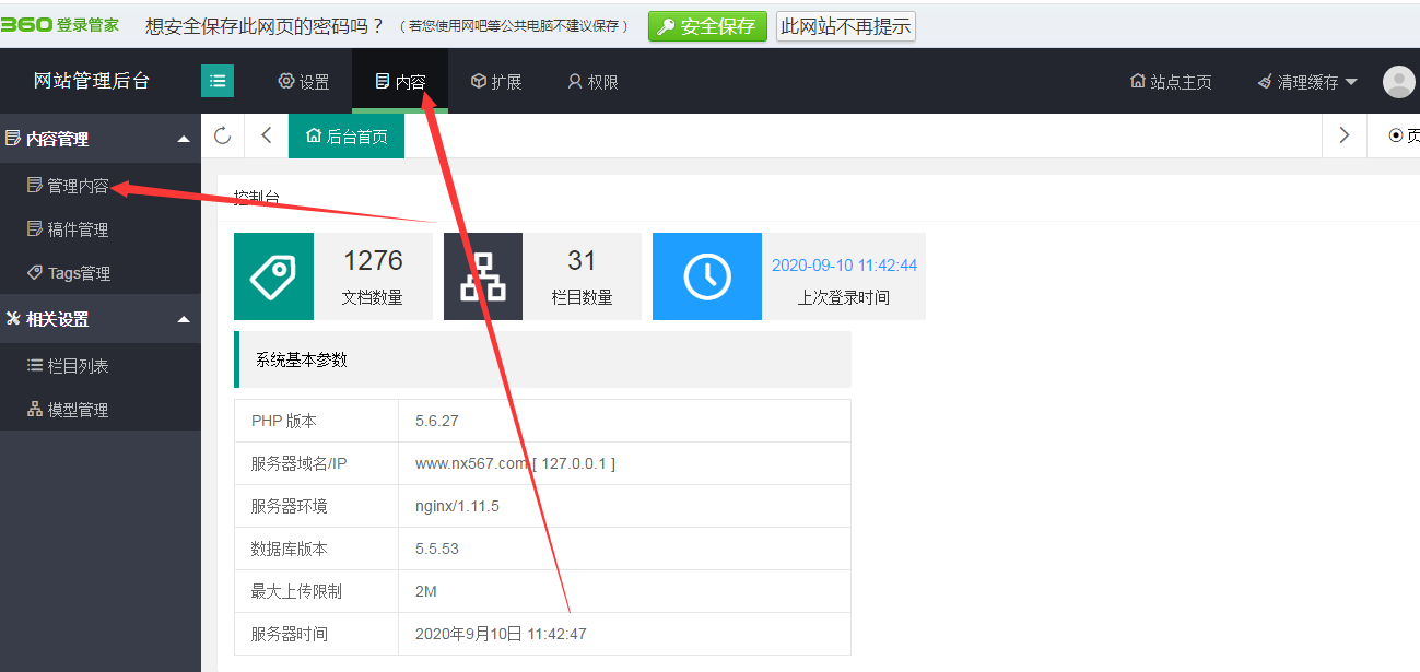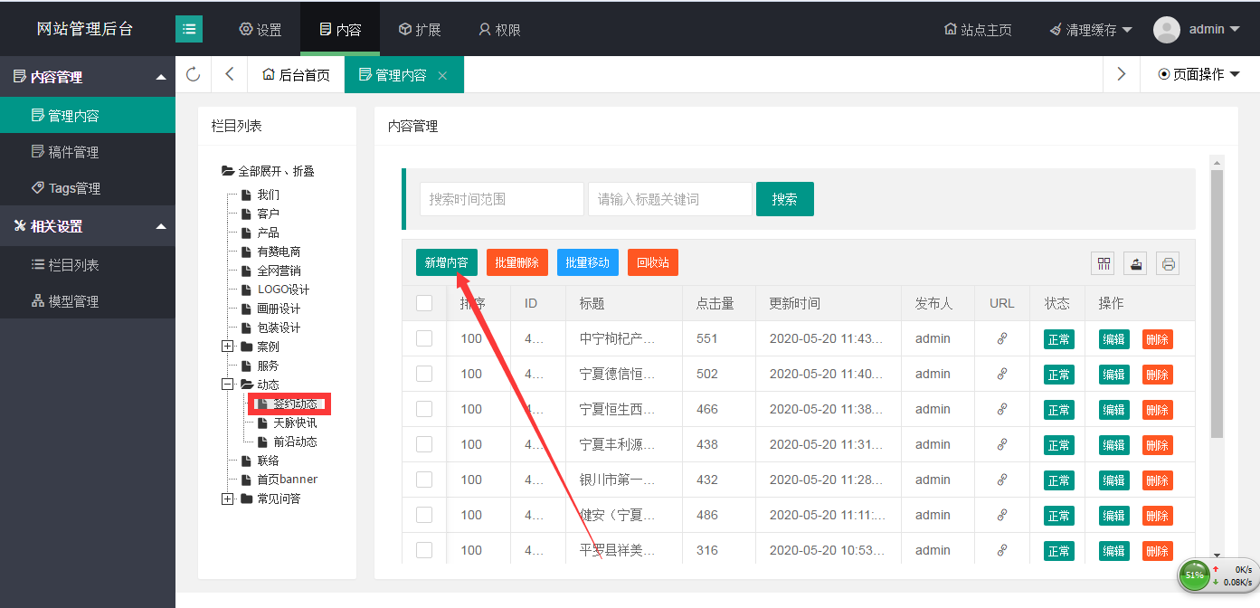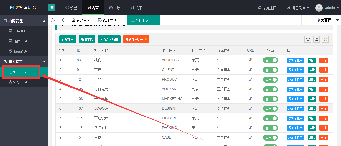 添加內容時,點擊內容,再點擊左側的管理內容,就會出現相對應的欄目