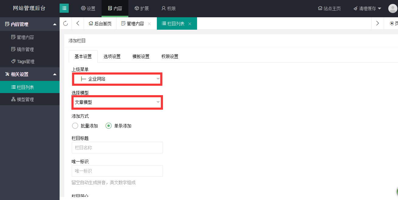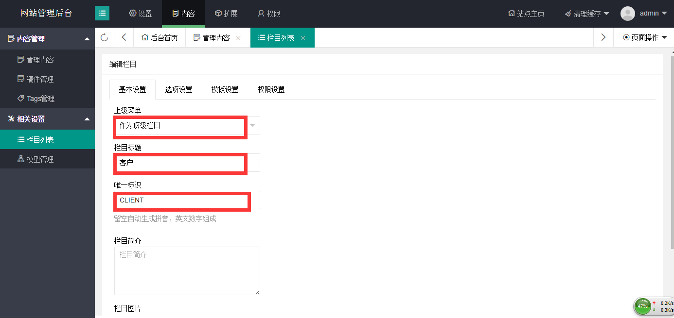 添加新的欄目時,點擊新增欄目,紅框中的內容添加完整,然后點擊立即添加即可。