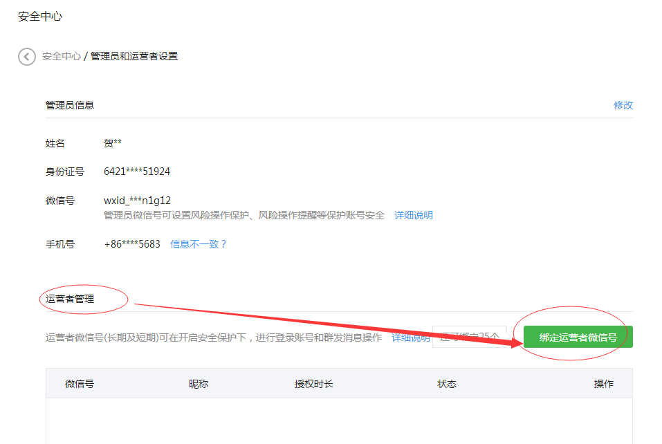 運營者添加與刪除,點擊綠色綁定運營者微信號按鈕