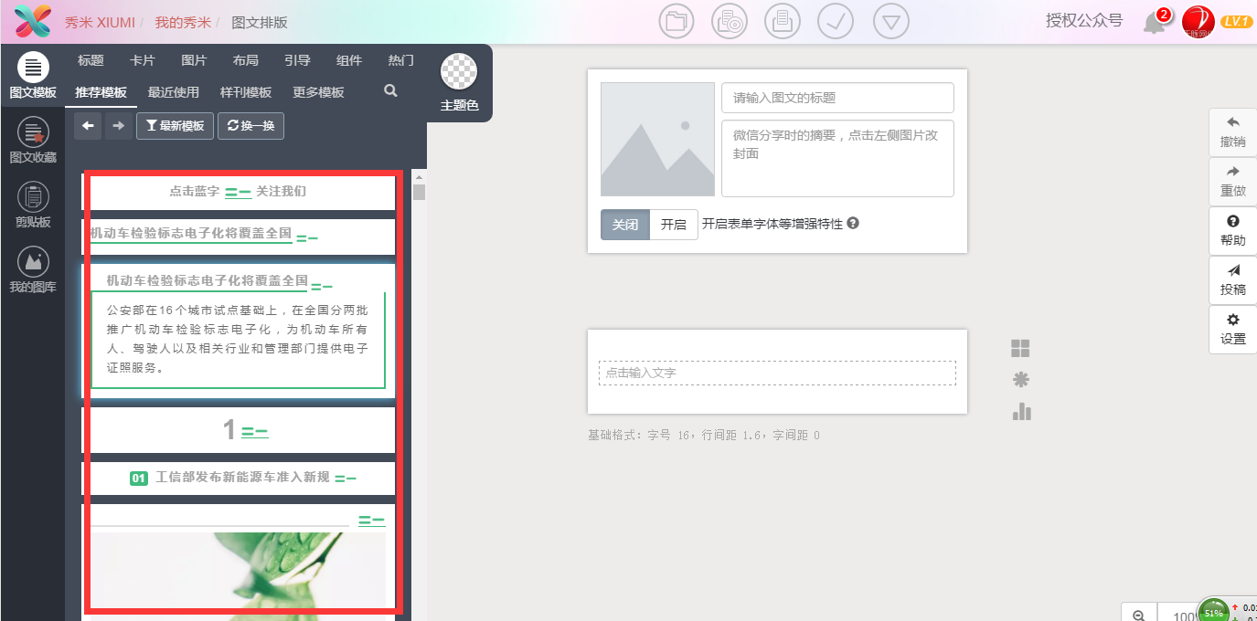 圖片可以在我的圖庫(kù)中上傳圖片,也可以從左側(cè)的圖文模板中直接把圖片托進(jìn)來(lái)